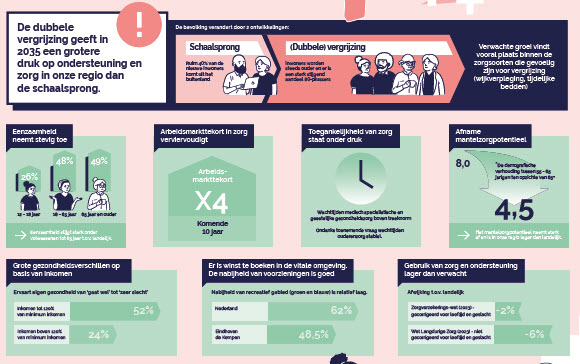 Binnen tien jaar dreigt in de regio Eindhoven–De Kempen een fors tekort aan zorgcapaciteit. Naast de schaalsprong vormt de dubbele vergrijzing de grootste uitdaging. De daarmee gepaard gaande stijgende zorgvraag én een oplopend tekort aan zorgpersoneel, zorgen ervoor dat de regio straks niet meer alle benodigde zorg kan leveren. Dat blijkt uit het nieuwe Regiobeeld van DE STAP naar gezonder Eindhoven–De Kempen.